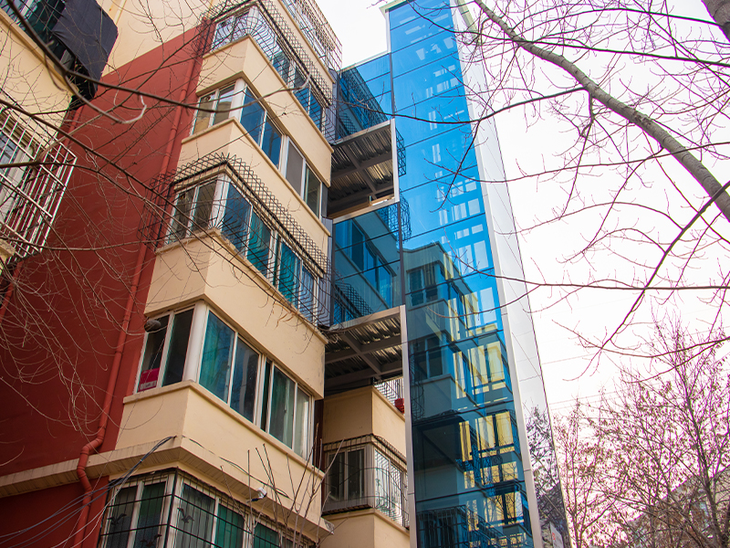 加装特色快装式钢结构电梯可定制式设计、生产。外部提供全透明玻璃、彩钢瓦、铝塑板等近十种装潢以供选择。